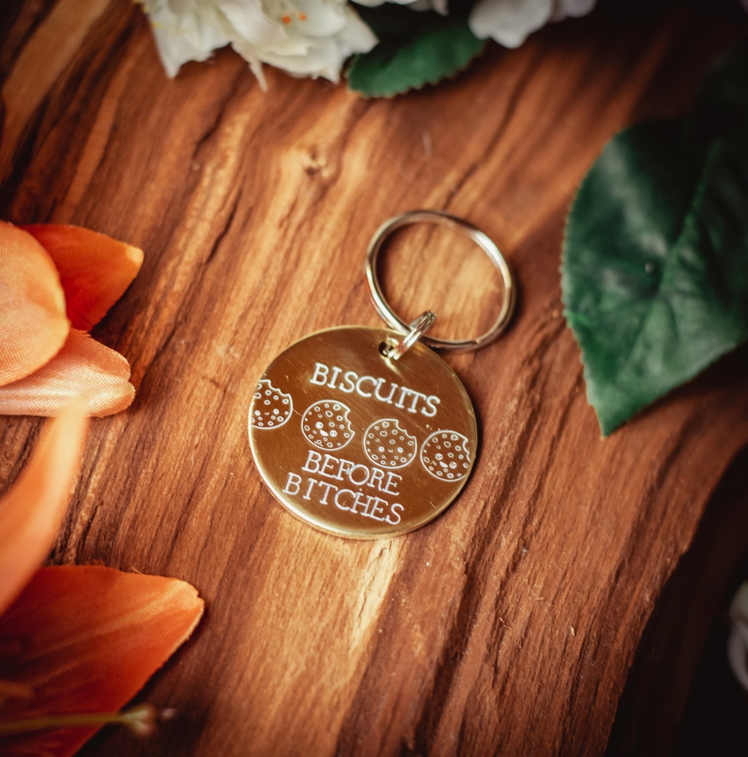 a 35mm brass tag with the phrase biscuits before bitches and happy cookie designs along the centre.