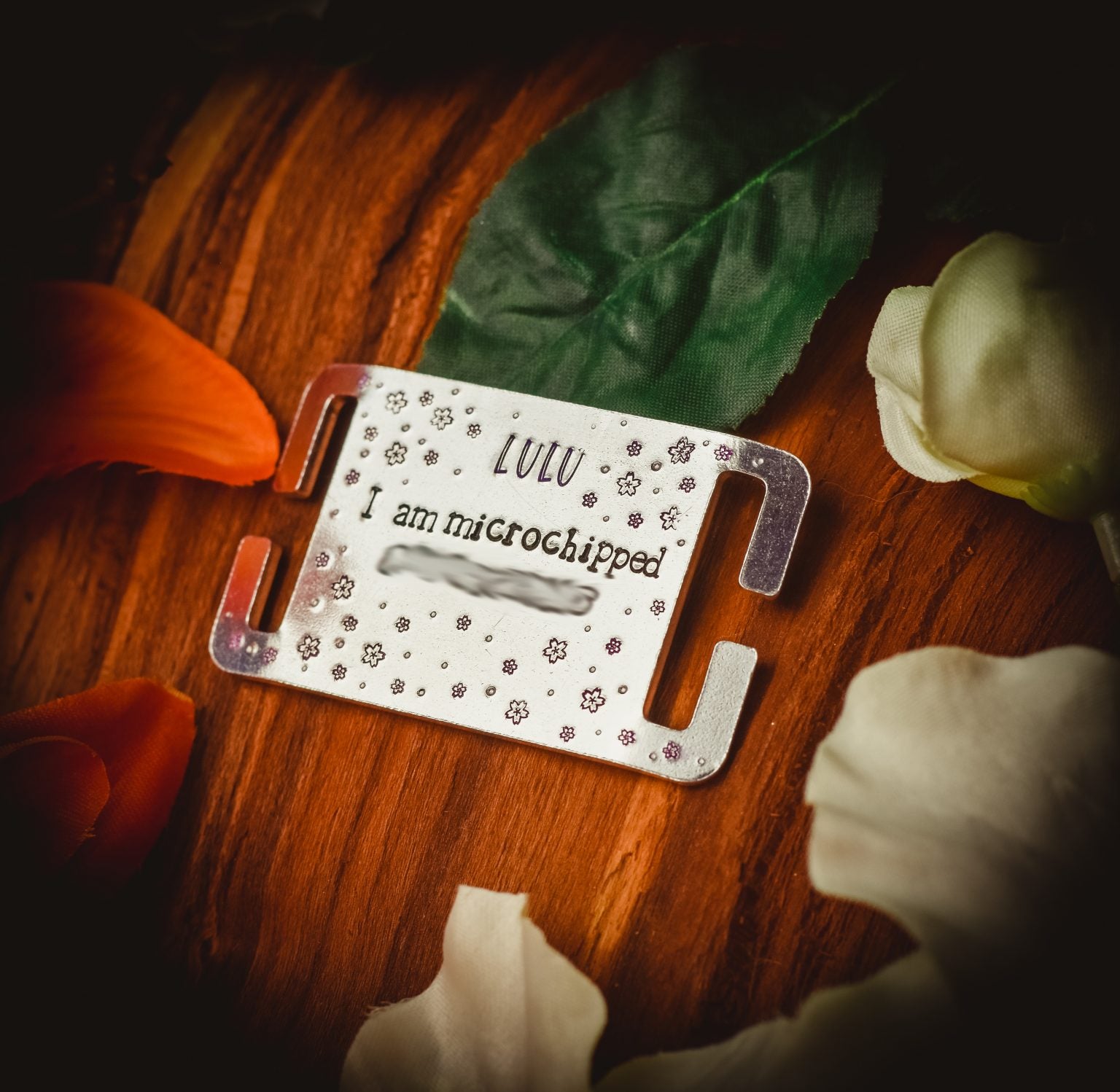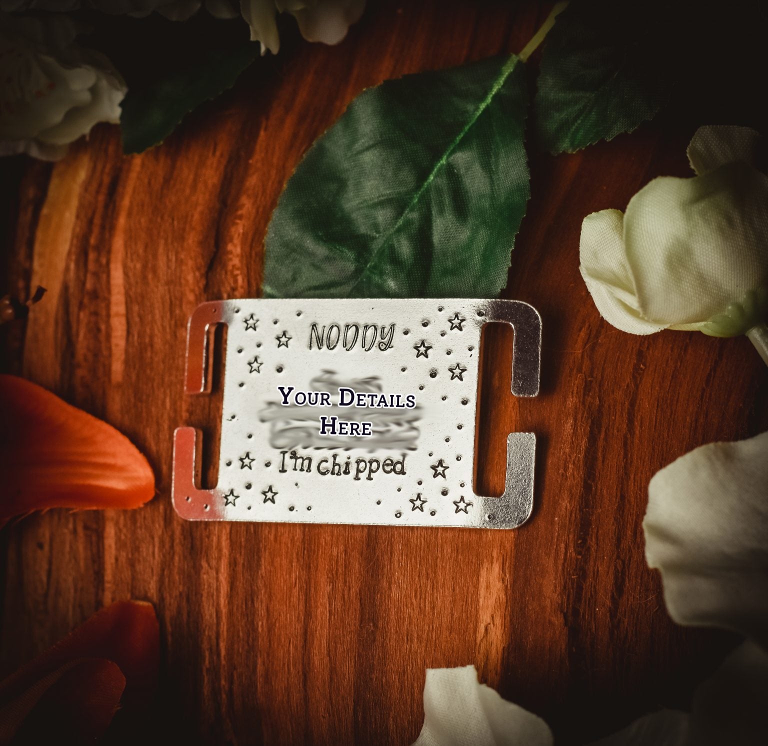 The top line can be for your dogs name or a short phrase. These tags are available as a plain base, or with either a heart or a paw print cut out, so the collar can show through.