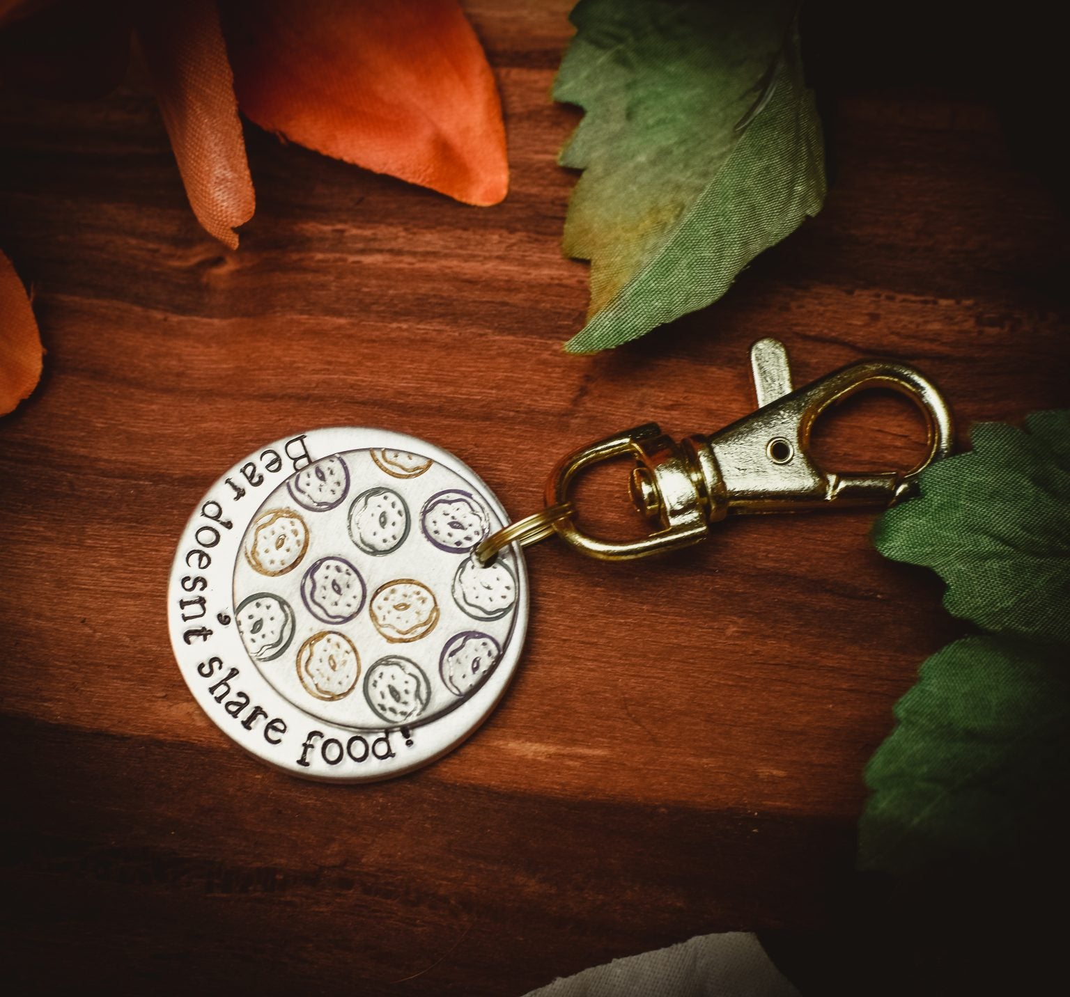 This tag is 32mm aluminium with a 25mm aluminium disc, decorated with your dogs name followed by the phrase doesn’t share food, doughnut designs in blue, purple and gold. If you don’t wish to have your dogs name on the tag we will replace the phrase with I don’t share food.