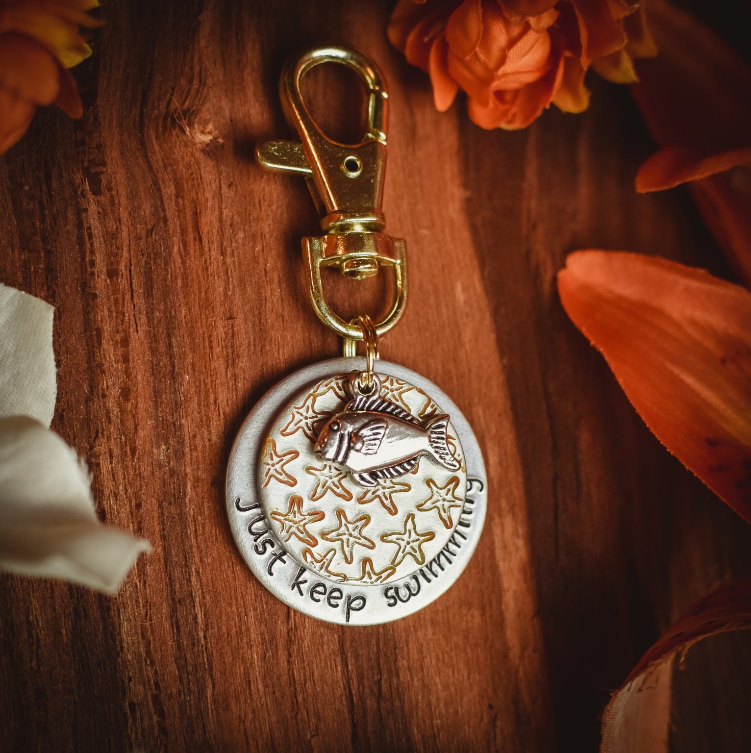 This tag is 32mm aluminium with a 25mm aluminium disc, decorated with the phrase just keep swimming, with orange starfish designs, attached is a silver fish charm.
