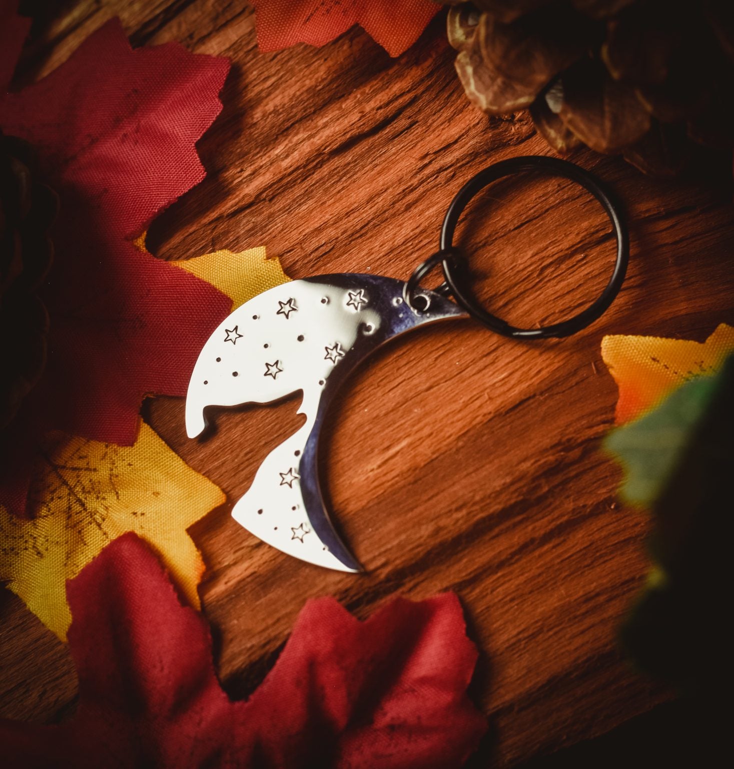 A mirrored silver stainless steel tag shaped like a crescent moon with a howling wolf cut out and stars