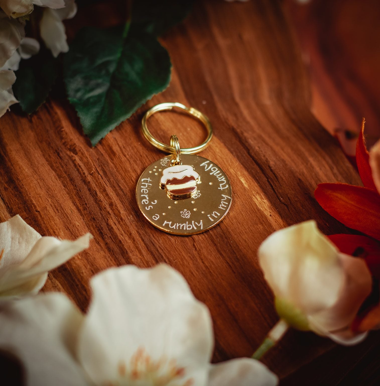 The phrase there’s a rumbly in my tumbly around the edge on a 32mm brass tag, with little bees and a honeypot charm